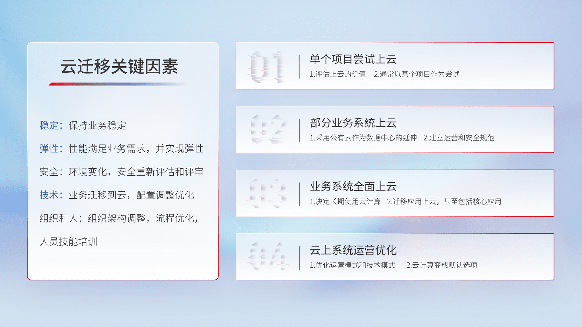 结合实际业务,,,,从规划设计、、、云平台选型、、、云原生改造、、、数据迁移、、、、集成交付,,,迁移全过程为客户识别最佳上云路径,,做好风险识别管理,,,,设计网络架构、、、身份权限、、安全审计合规、、、、操作审计、、、日志审计、、、监控告警策略、、、多站点容灾设计等,,,对云上基础设施进行整体规划,,,,提升IT治理水平,,以满足弹性、、、高可用、、、高性能的需求。。。。