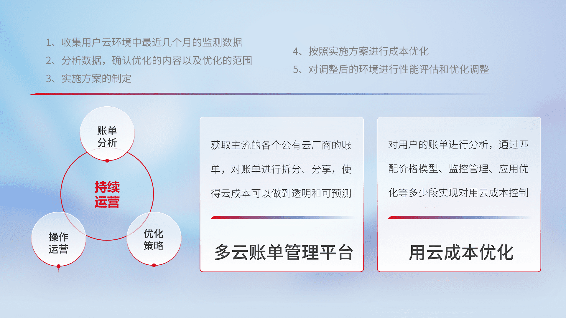通过多云纳管,,,以统一的资源数据模型把客户的云资源进行抽象和封装,,,进而实现对多云资源的统一操作,,,保障云资源管理的可靠性、、、稳定性与可用性。。。。量身定制化运维内容,,,配置、、开发运维、、补丁管理、、、、备份、、监控、、、、认证和访问管理、、审计和日常巡检等,,,保障在用云过程中的可靠度,,,,稳定度以及高可用率。。